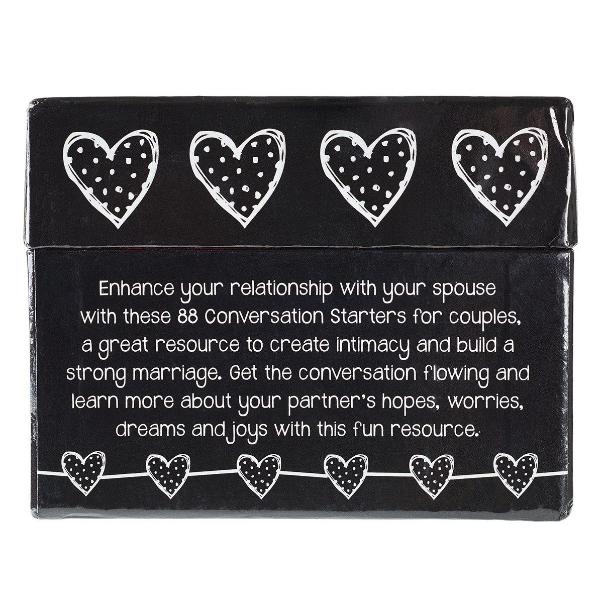 Each of the 88 conversation starter cards has a question and an accompanying Scripture verse or quote that is sure to spark some lively conversation and lots of laughter. But don't stop at just answering the questions. Hone your conversation skills by asking follow-up questions, like why, when, or how does it make you feel. These cards are only intended to help you start a conversation—it's up to you to continue it. The Scripture verses and quotes on the cards are meant for encouragement and can even be used for further discussion.