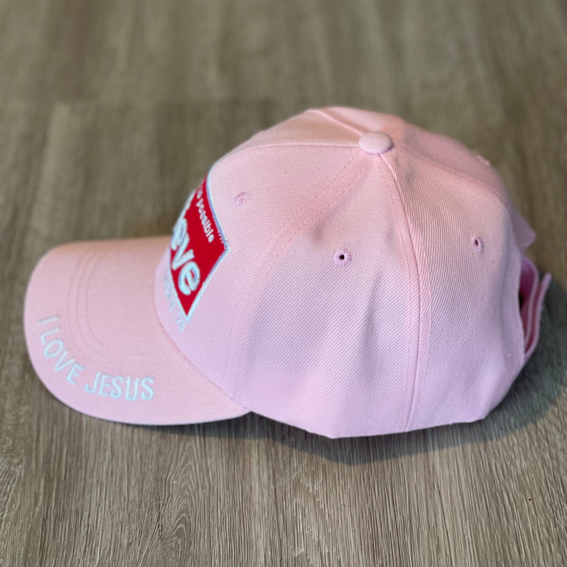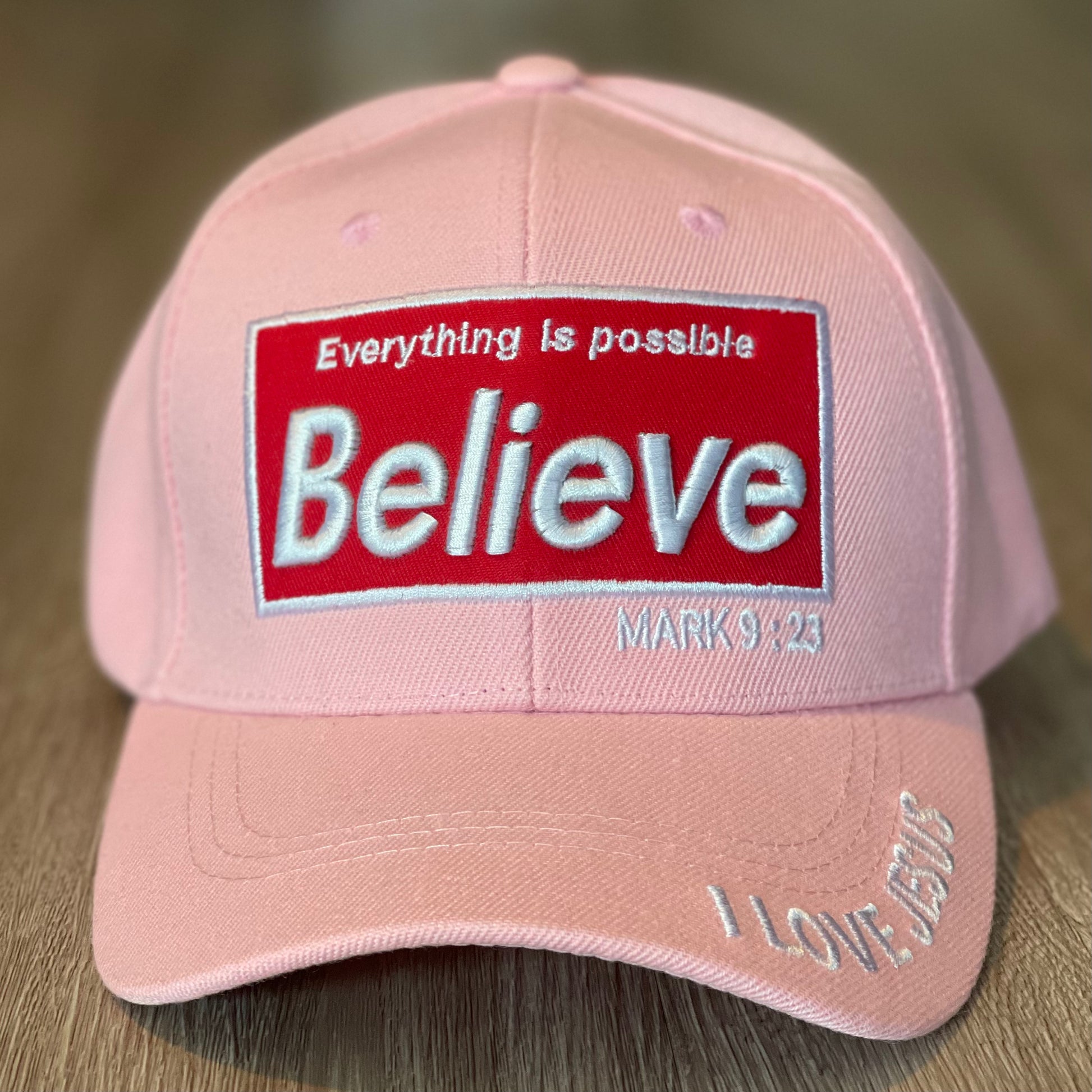 Everything is possible if you Believe! Get this fashionable baseball hat embroidered with the words from Mark 9:23. The phrase "I Love Jesus" is embroidered on the brim and “Jesus” on the Velcro closure.