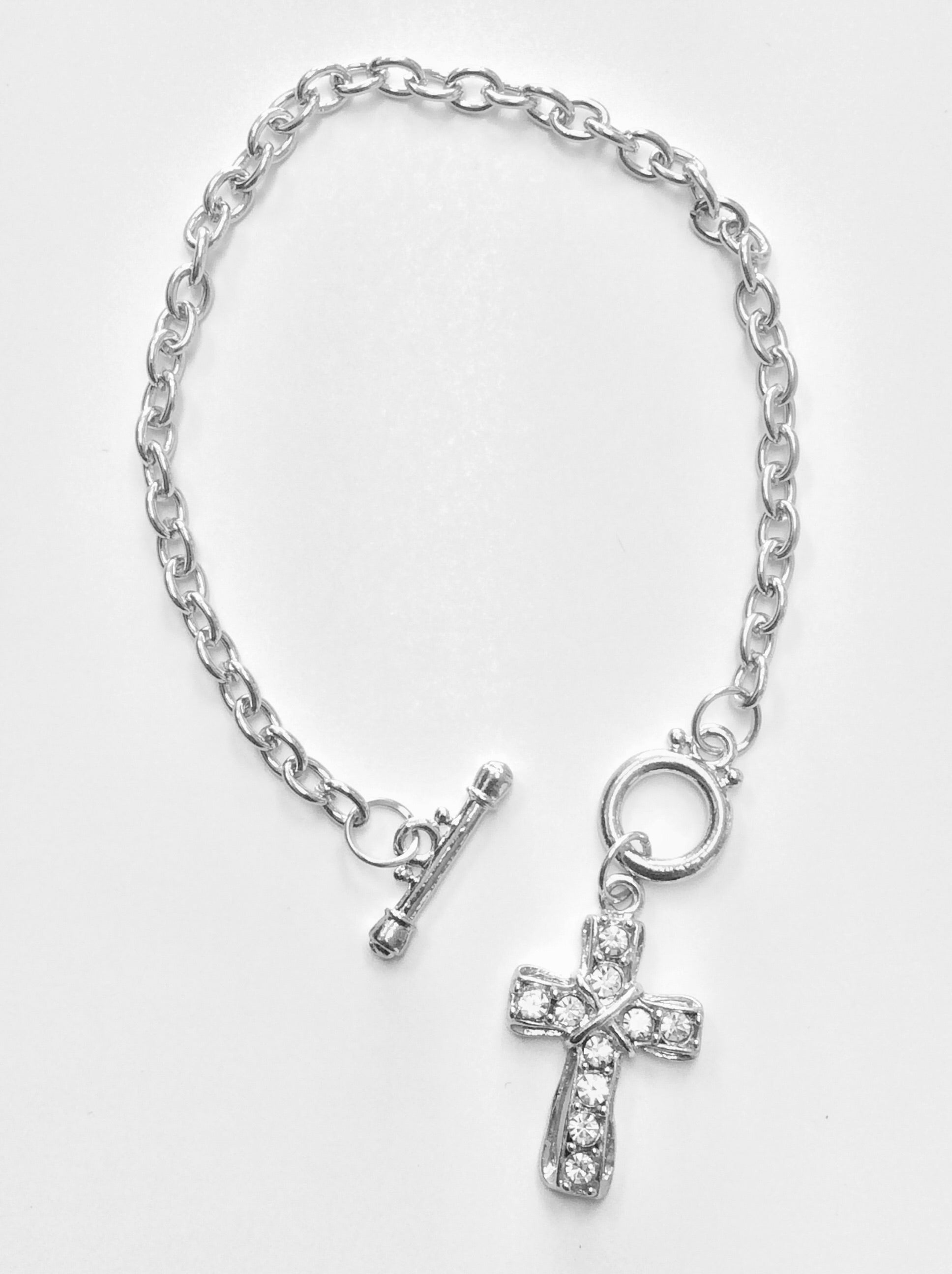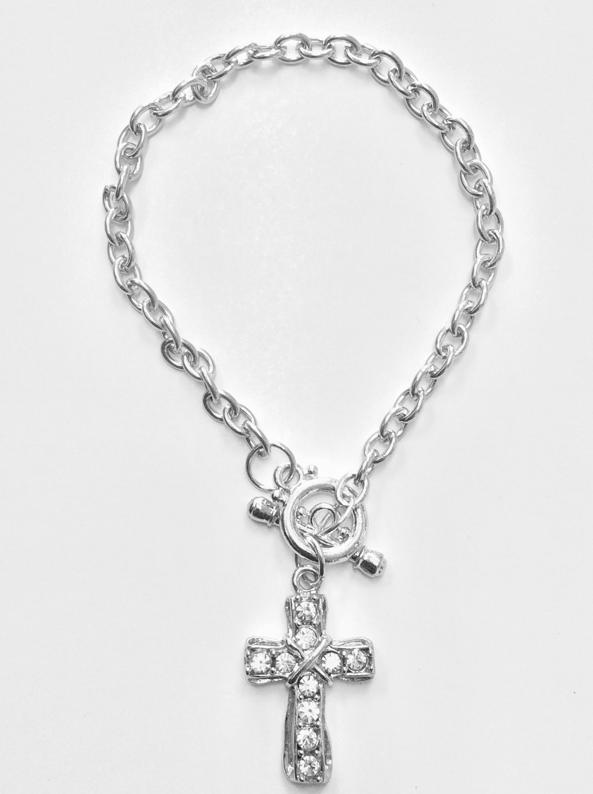 Celebrate your faith with this pretty silver bracelet with crystal cross charm. This bracelet features a chain link with a cross dangling from the toggle clasp. The bracelet has a highly polished finish, and makes a wonderful gift so order several today at our reasonable price.