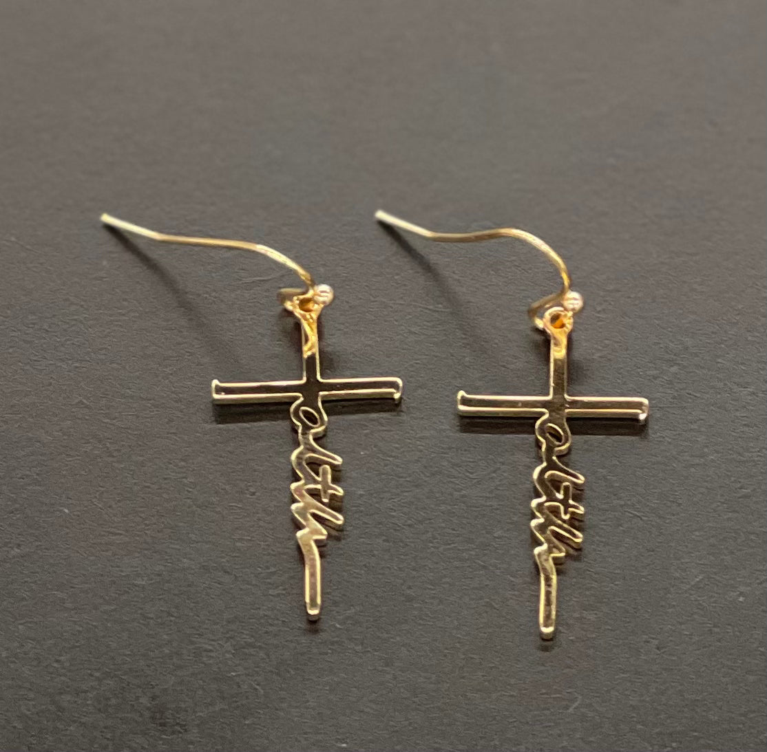 Add inspiration with these stunning Faith script text cross earrings. Available in goldtone or silvertone.