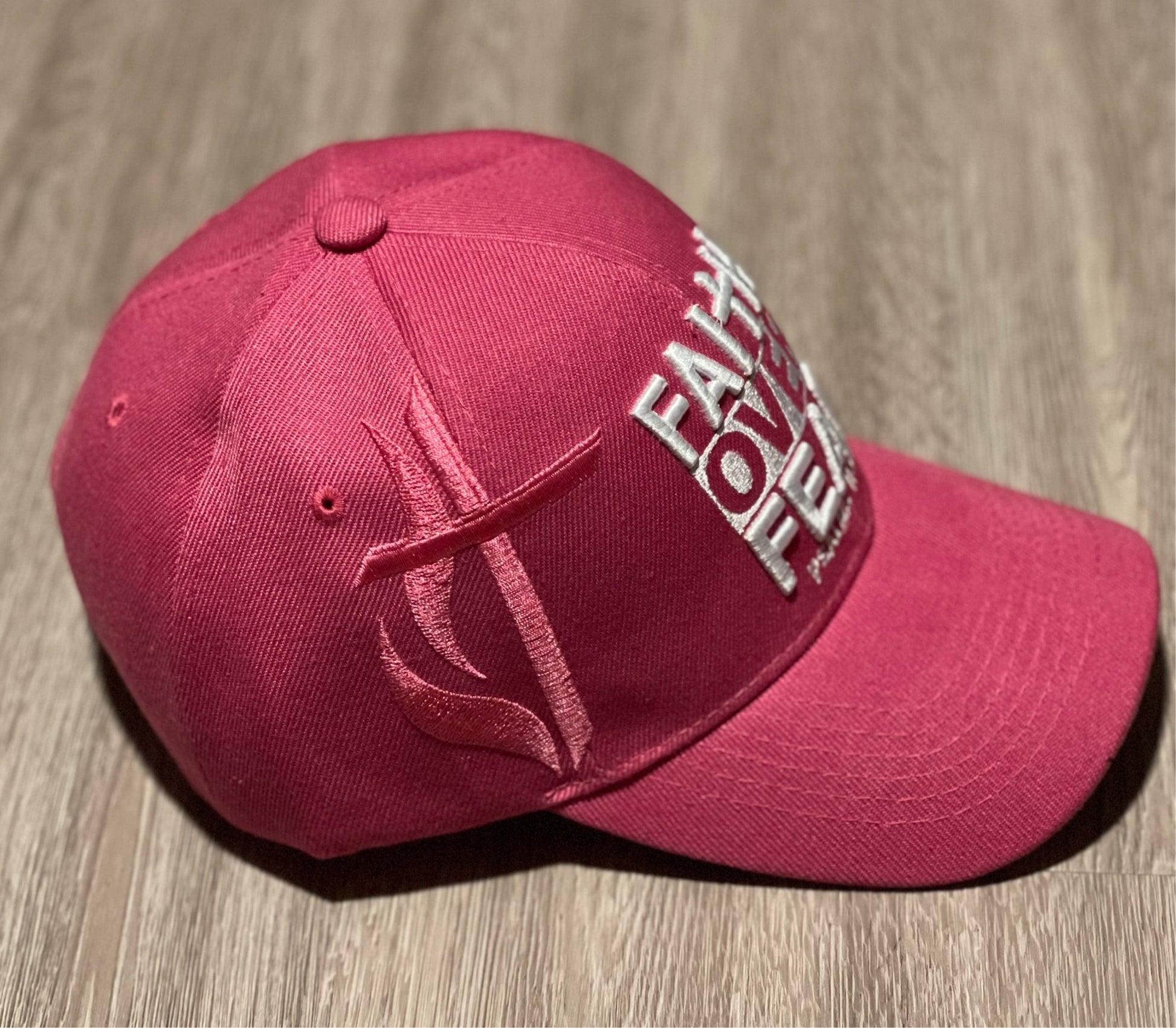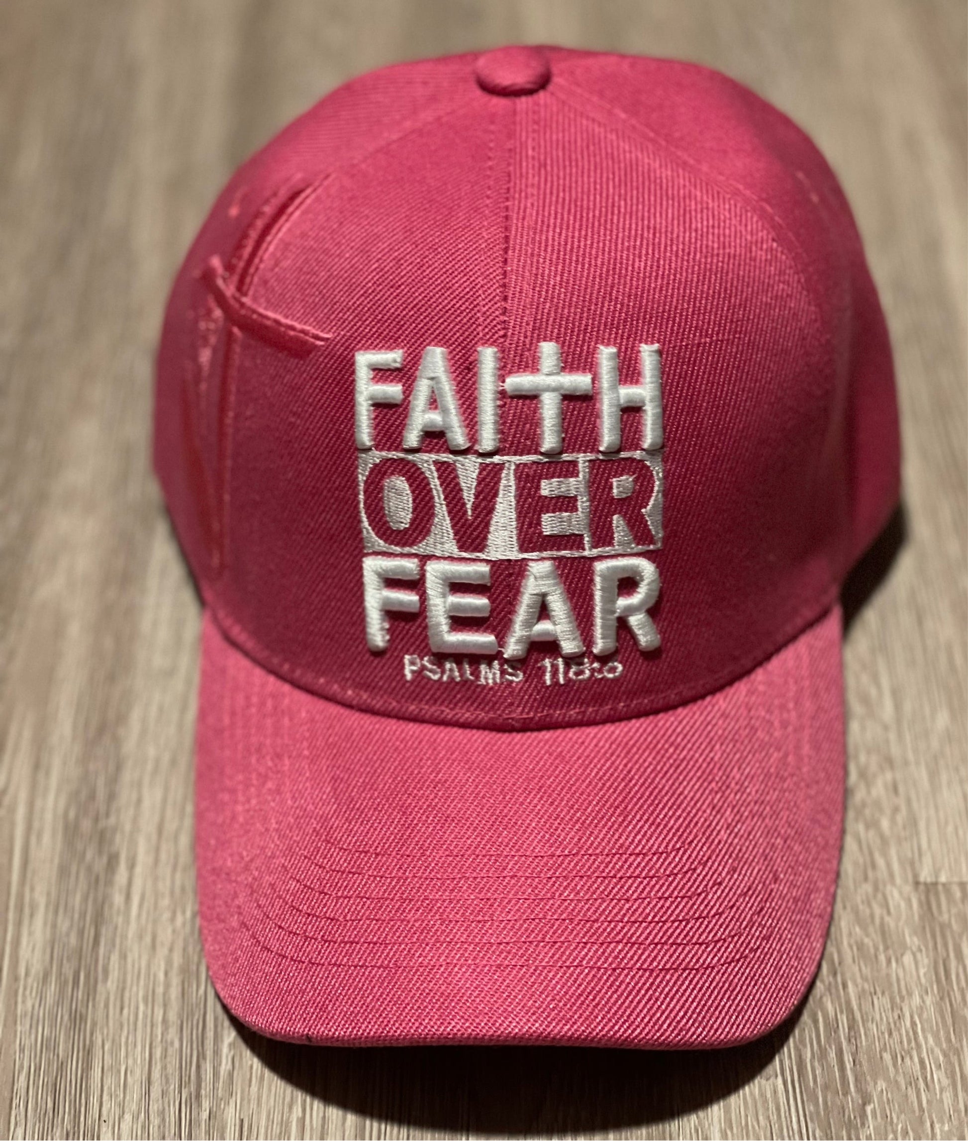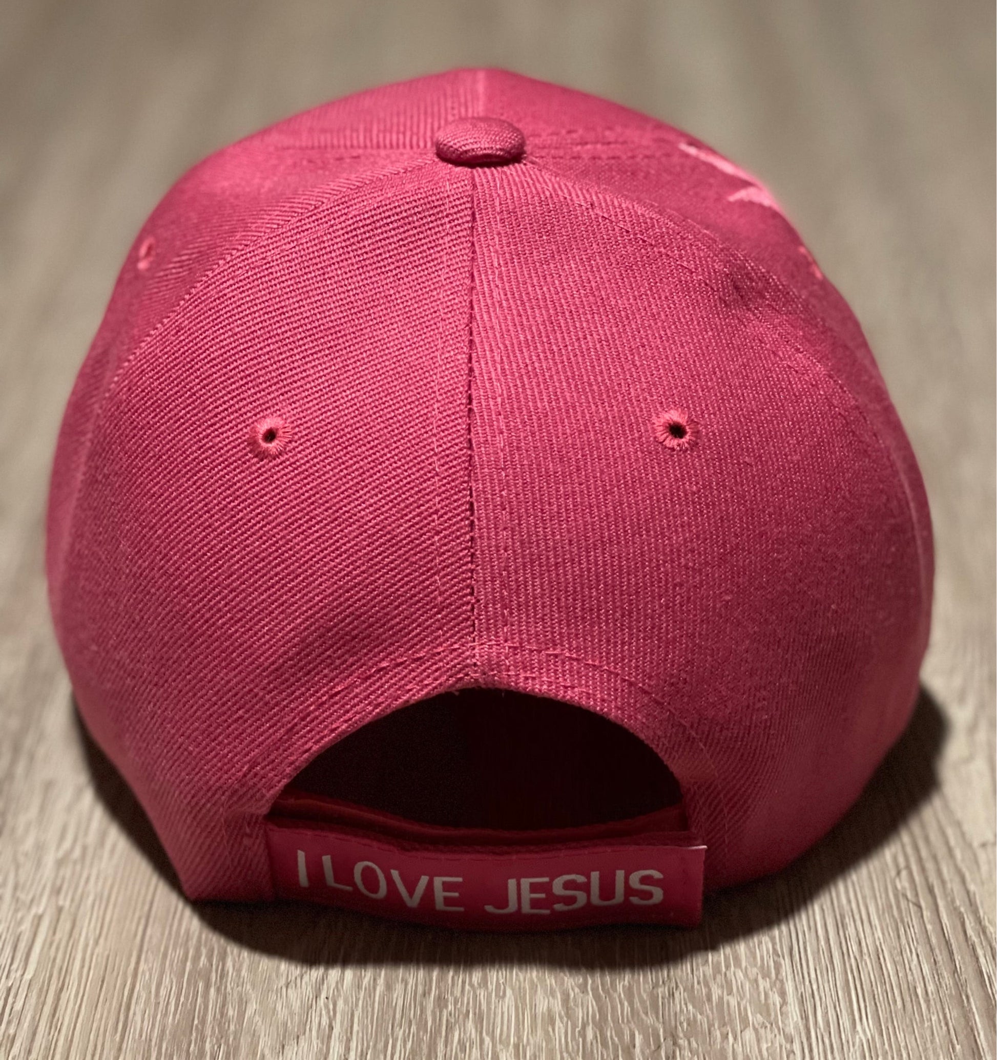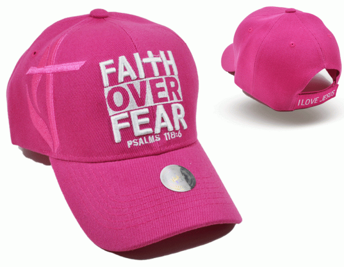 Make a faith and fashion statement with this Psalms inspired baseball cap. Faith Over Fear is embroidered on the front panels along with Psalms 118:6. The phrase "I Love Jesus" is embroidered on the back closure.