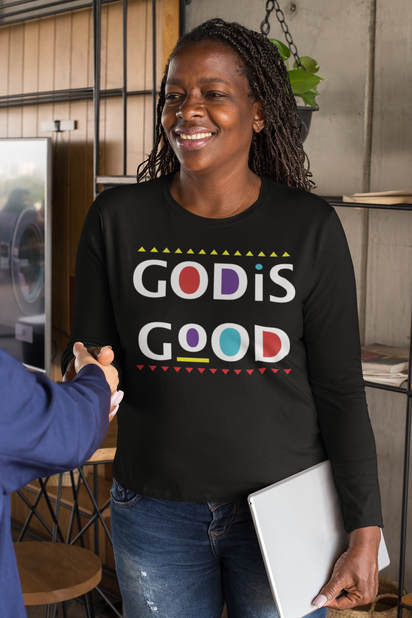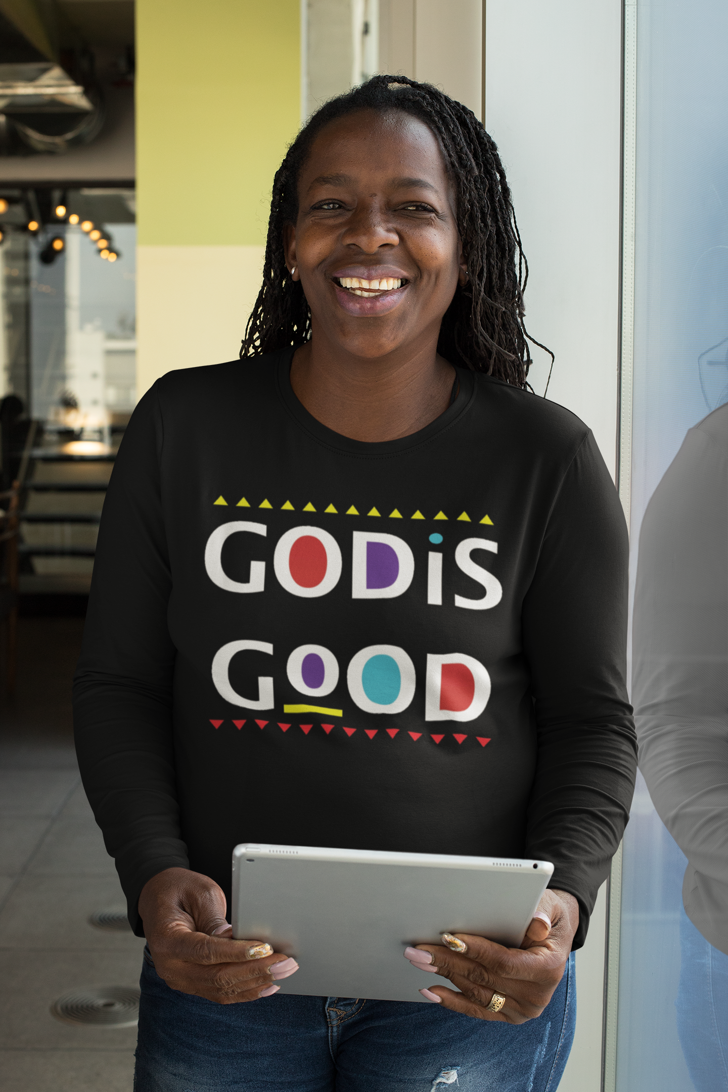 Make a faith and fashion statement with our God is Good Long-sleeve T-Shirt. This colorful design features the phrase, “God is Good” with red, yellow, turquoise and purple accents. Available in black. Unisex fit.