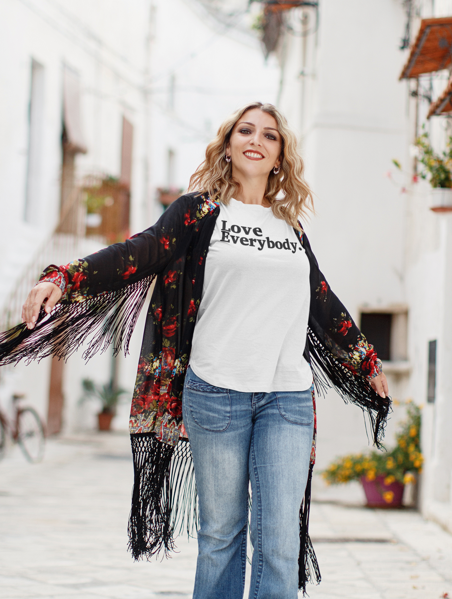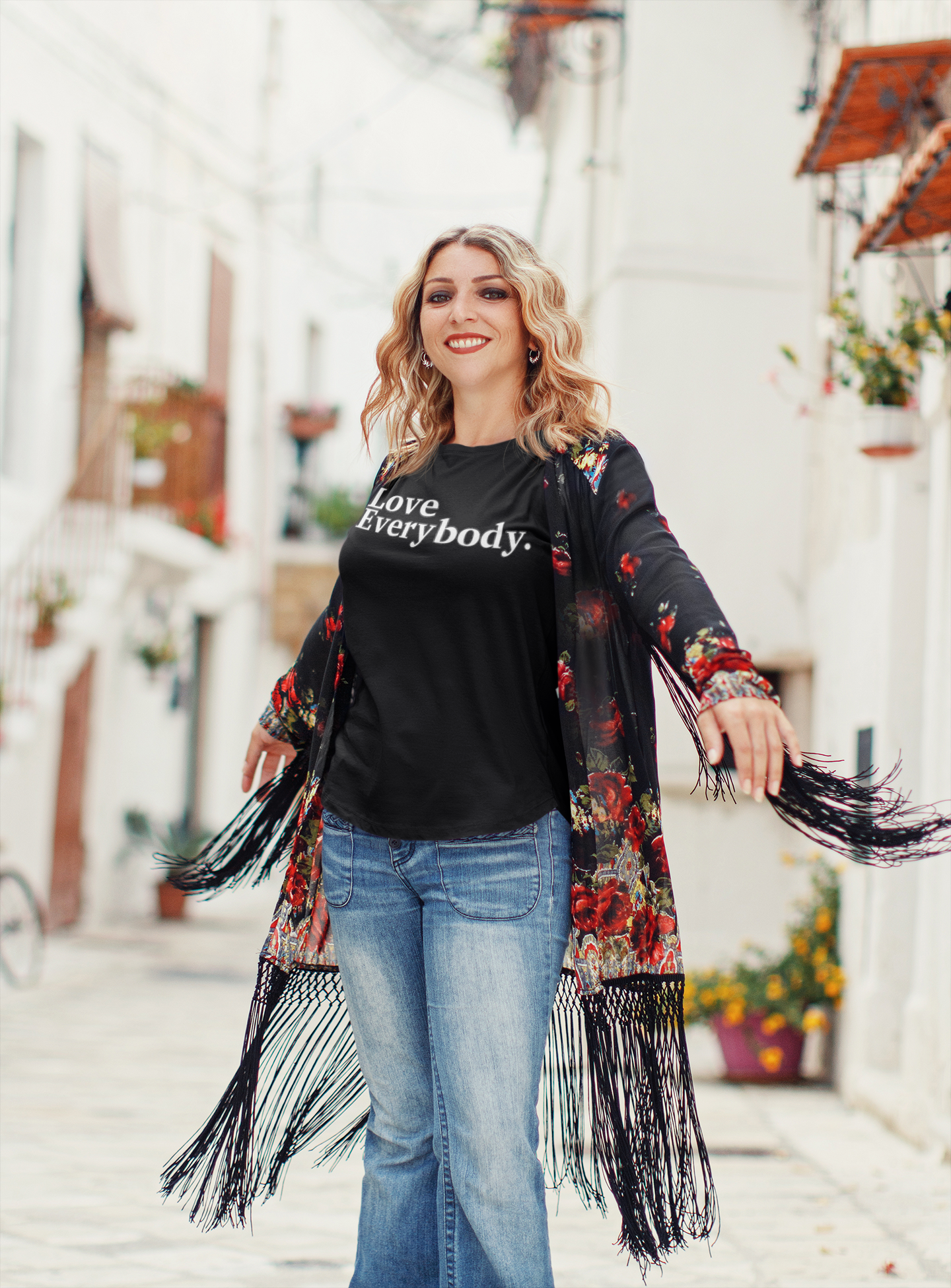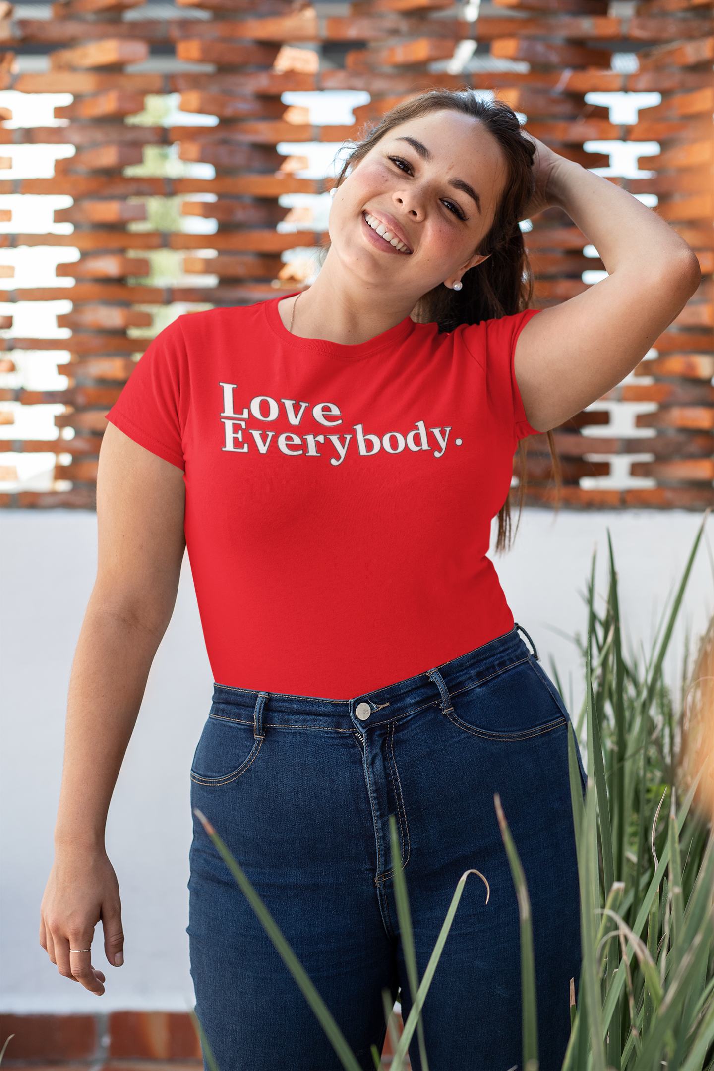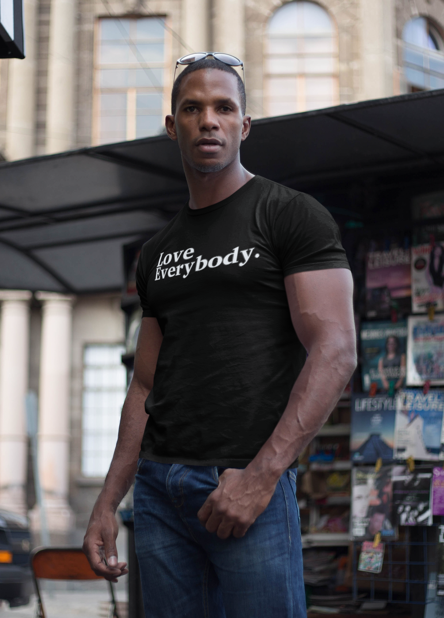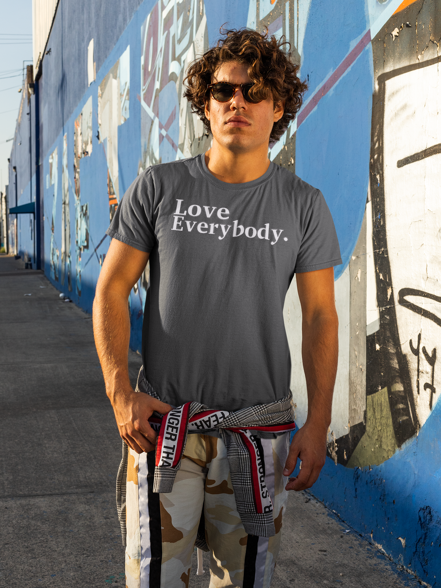 The message is simple...Love Everybody. Our gender neutral, unisex fit Love Everybody t-shirt is available in black, white, red and gray.