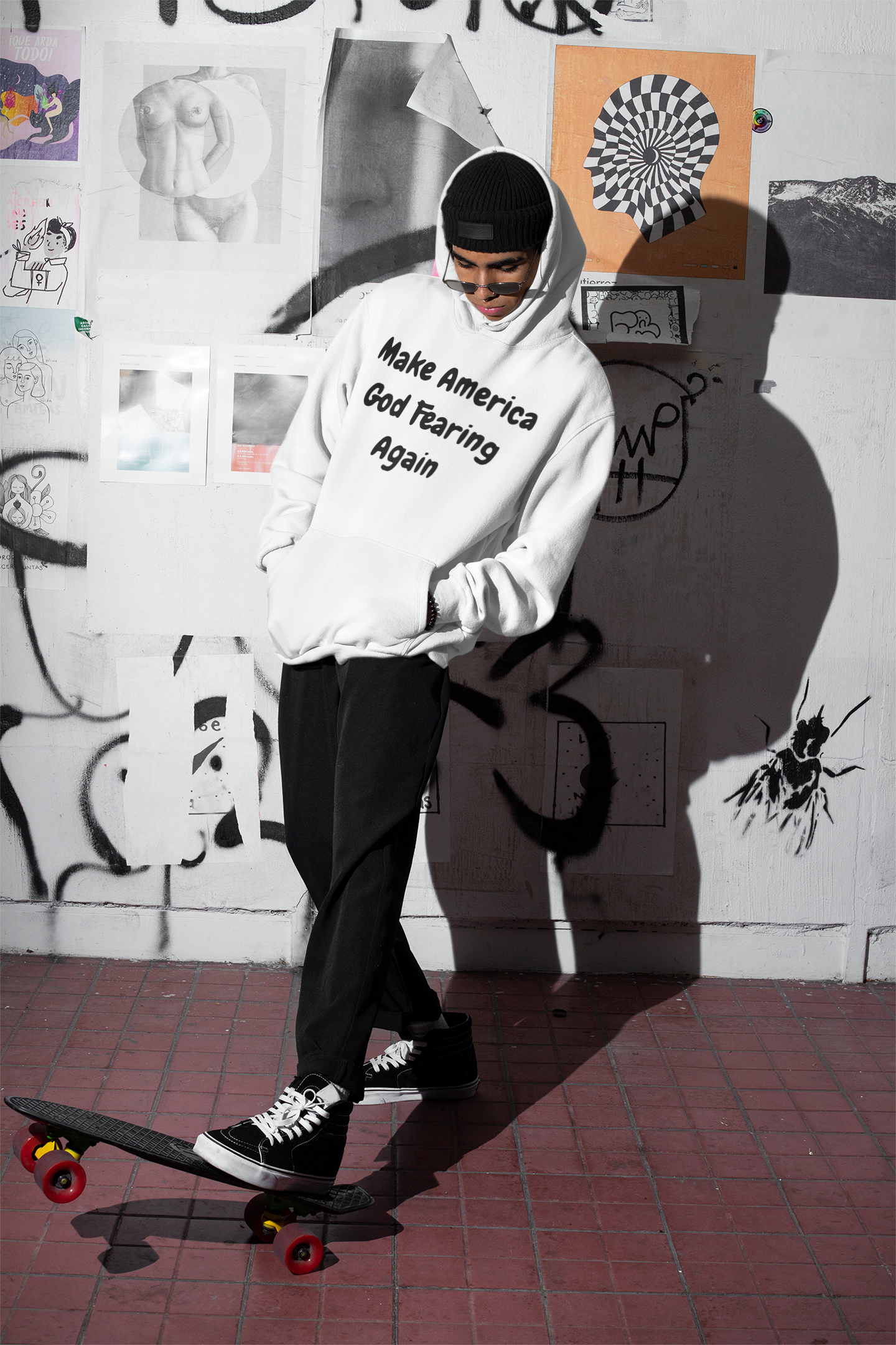 Make a faith and fashion statement with our custom, unisex "Make America God Fearing Again" hoodie.