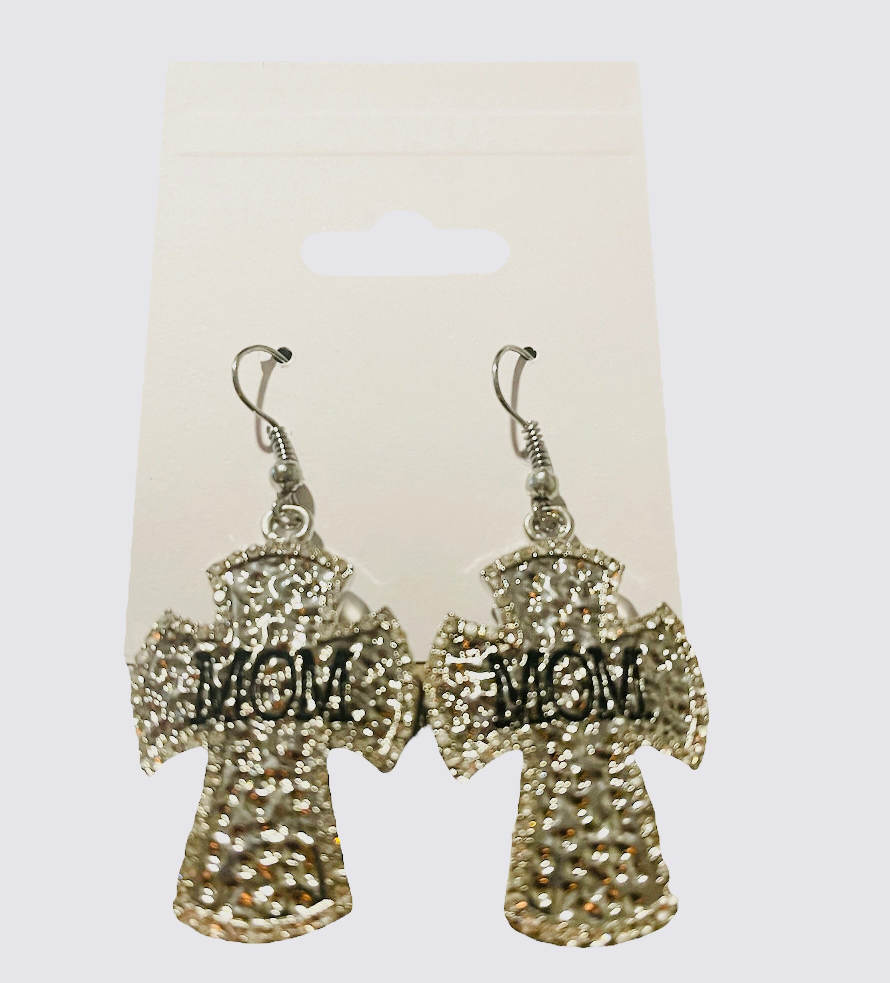 Hammered cross earrings completed by shimmering crystal stones, and the word "MOM" etched into the design. A perfect accessory for church on Sunday or a cute casual ensemble. These make a great gift for the mom in your life.
