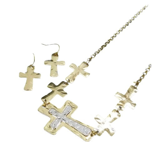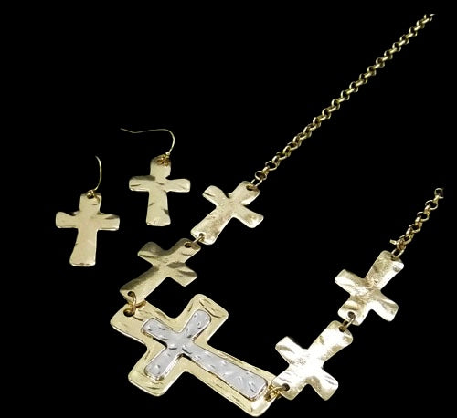 Beautiful gold and silver tone hammered cross necklace and earrings set. Necklace has lobster claw clasp closure, Fish hook earrings. Necklace is 8" plus 3" extender.