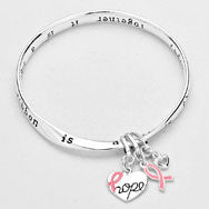 This is a beautiful polished rhodium silver mobius bangle that features three inspirational charms (hope, pink ribbon, and heart) along with these words: "Pink is the color of Strength, The ribbon is a symbol of Hope, Together it is a sign of Victory." A wonderful message for that friend or loved one who has beat or is fighting this disease!