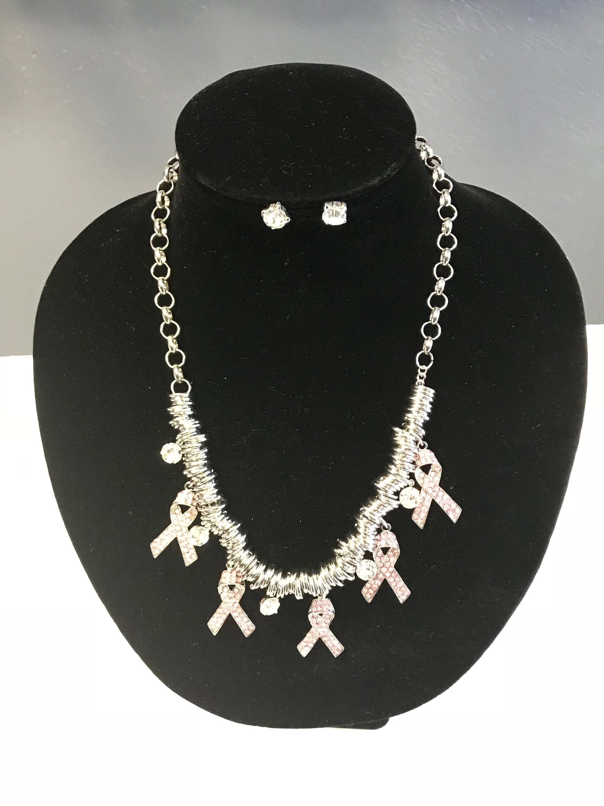 This pink ribbon charm necklace and earring set has beautiful crystal ribbon charms on a link silver plated chain that has a lobster clasp.