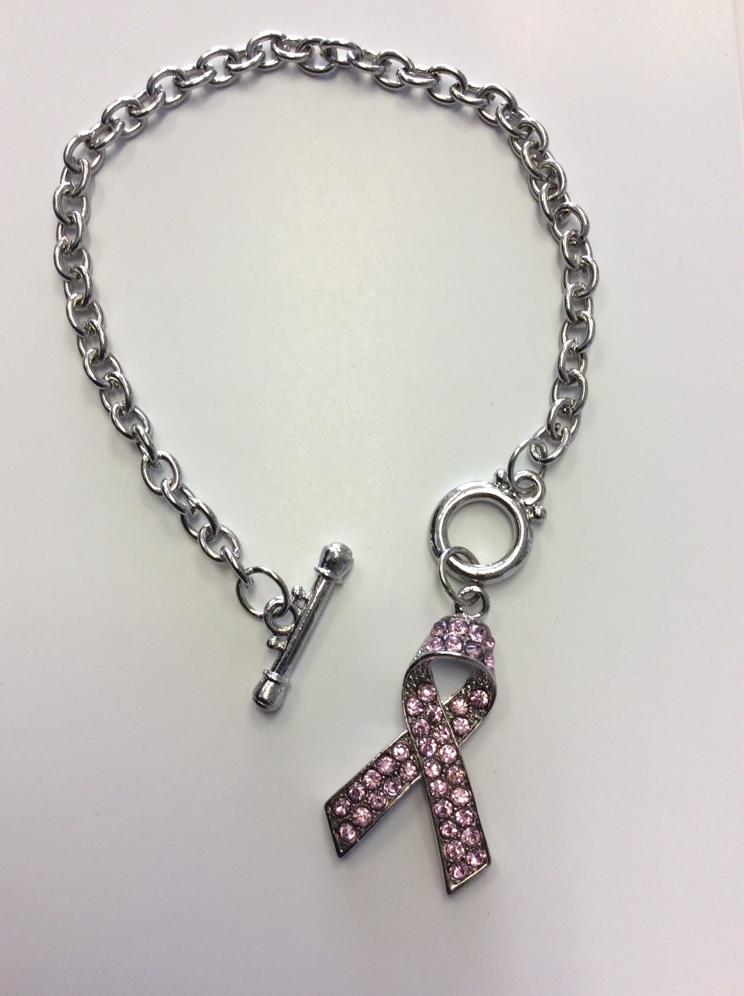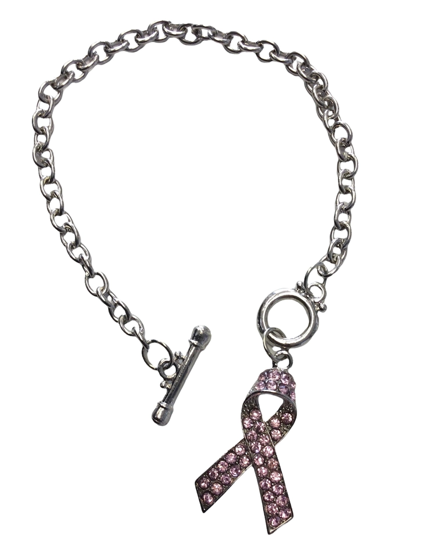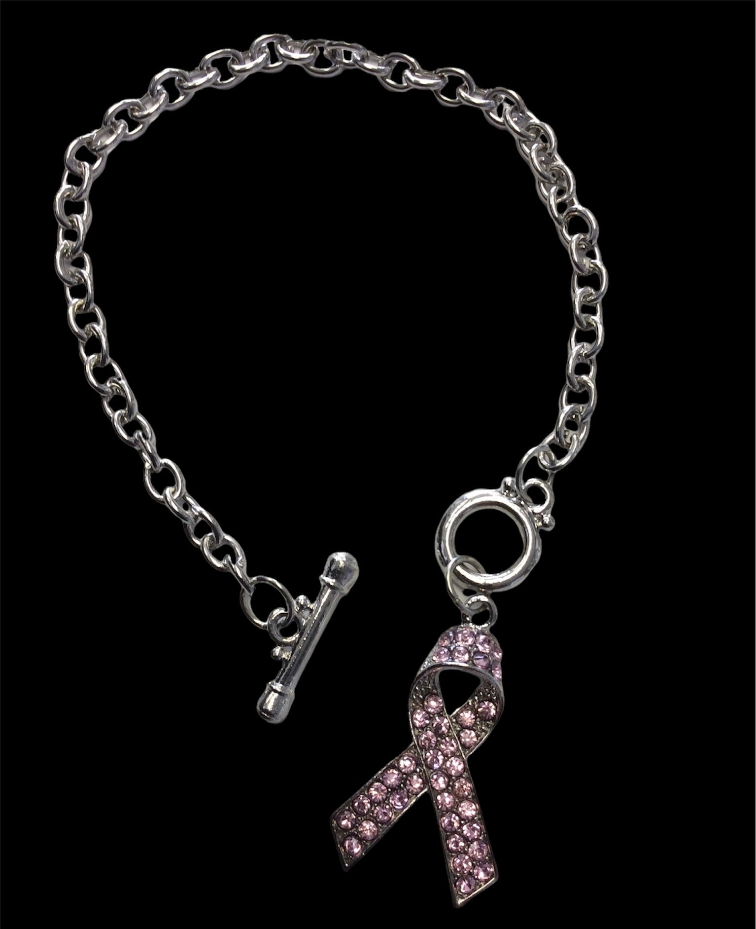 Proudly display your ribbon of hope. Our crystal pink ribbon bracelet is simple and elegant.