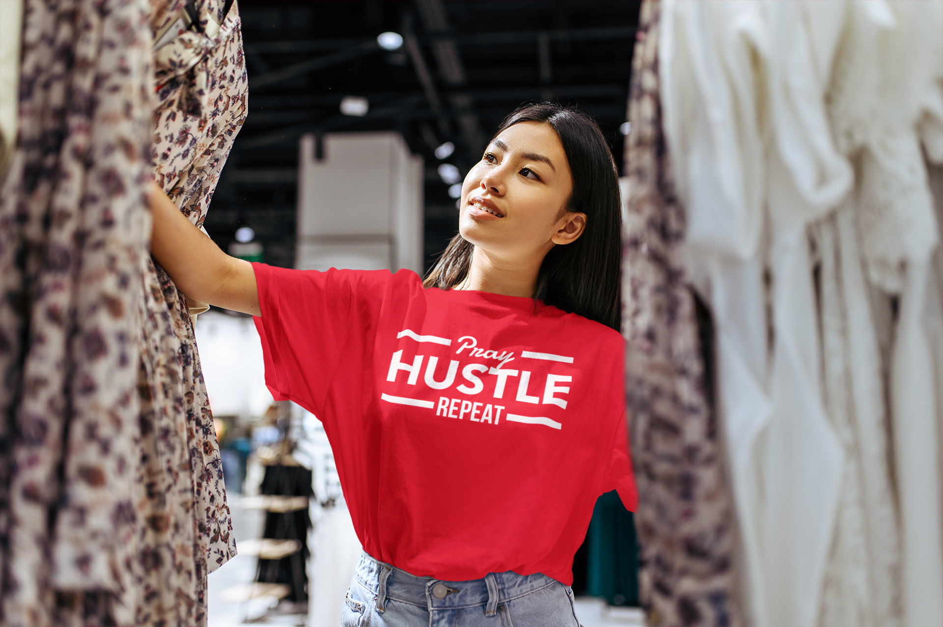 Pray (seek God). Hustle (work hard, put forth effort, strive for excellence). Repeat (do it again tomorrow). Entrepreneurs we see you, and this T-shirt was designed with you in mind.