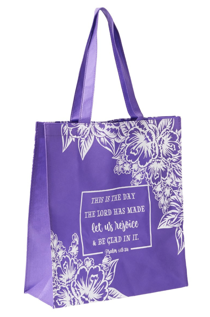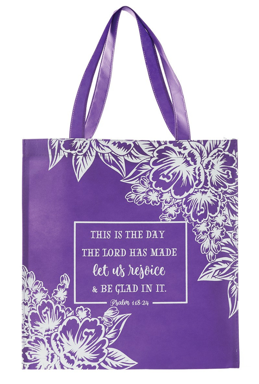 Easy to fold for storage, this bag is made from durable, non-woven polypropylene material and includes two carrying handles. The artwork on the front of this tote bag has a floral theme with the Scripture verse from Psalm 118:24 featured in the center.