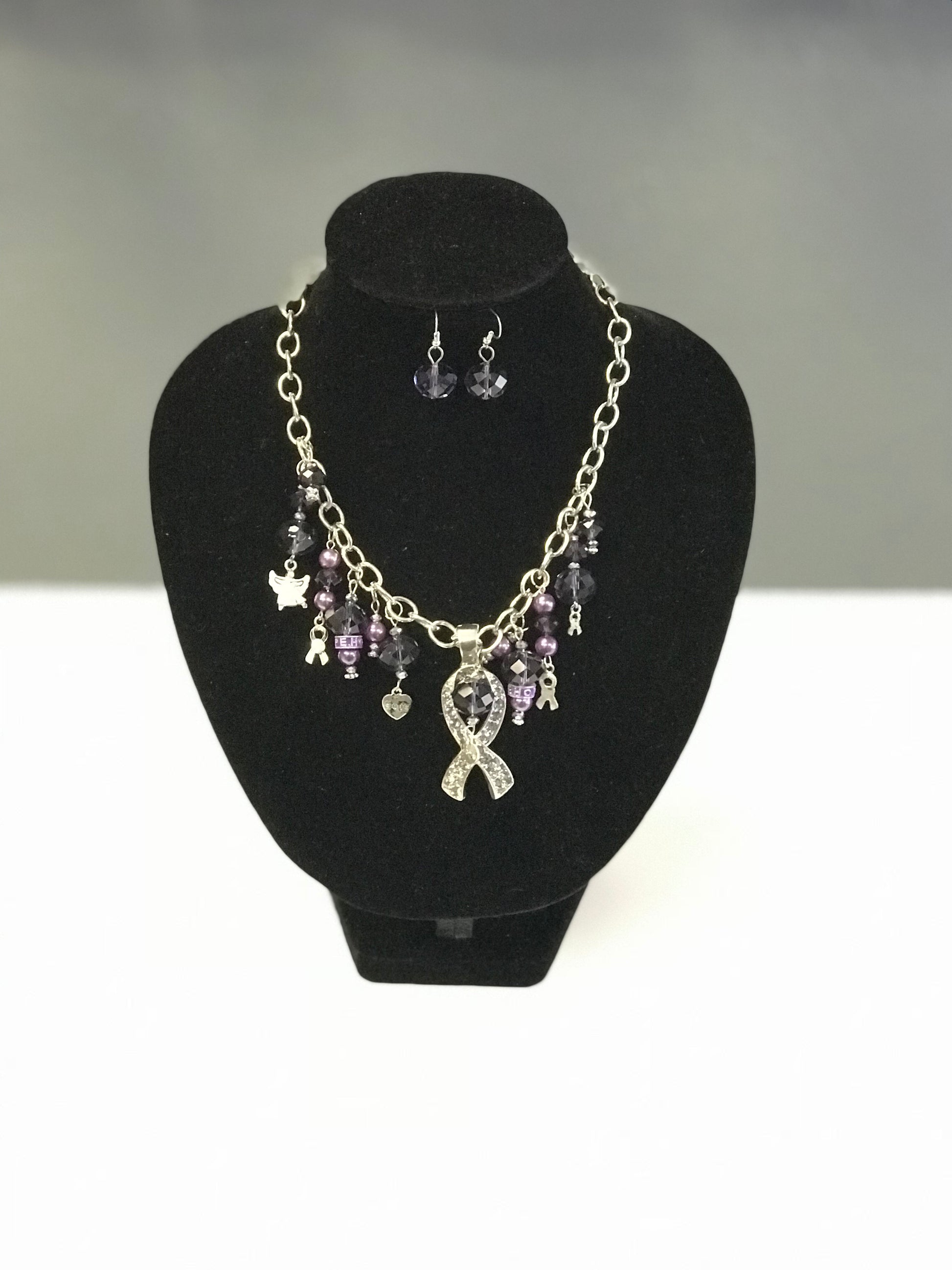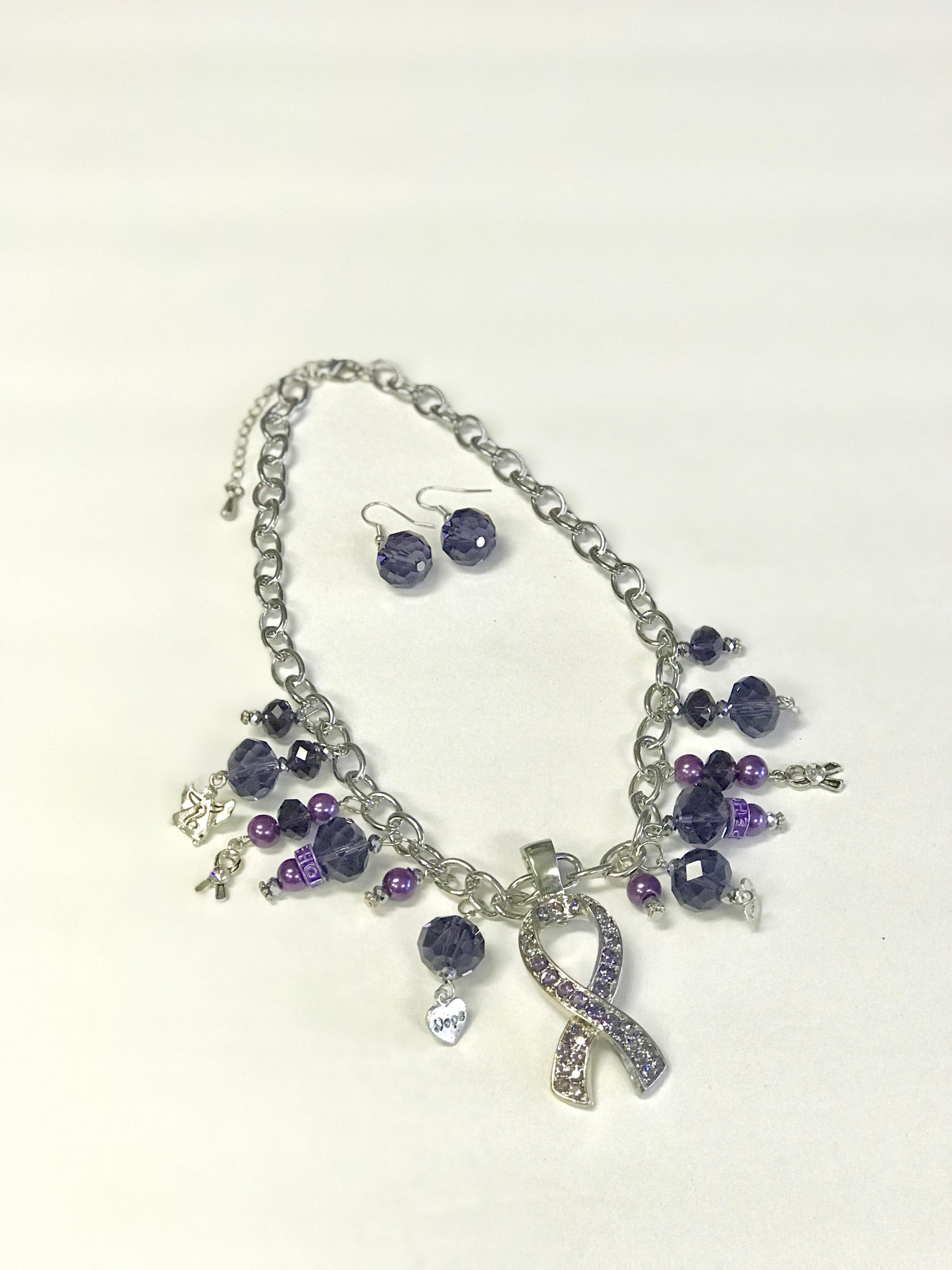 This purple ribbon charm necklace and earring set has a large purple crystal ribbon charm on a beautiful link silver plated snake chain that has a lobster clasp. This necklace features additional charms including silver ribbons, angels, and hearts inscribed with “hope”.